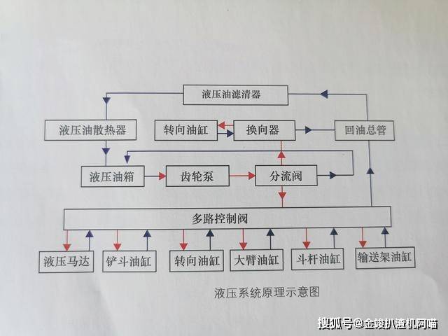 液壓油經(jīng)過齒輪泵加壓到多路轉(zhuǎn)向閥,通過操縱相關(guān)手柄控制對應(yīng)的閥路把液壓油輸送到個(gè)控制油缸,馬達(dá),而后馬達(dá)完成挖掘,行走,輸送等動(dòng)作。當(dāng)不工作是,液壓油經(jīng)多路閥向閥中間油道經(jīng)過濾清器過濾再又散熱器散熱后回流至油箱內(nèi)。